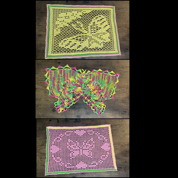 Though I sell modern remakes of antique patterns, I myself make a range of works with crochet lace. I deeply love crochet, but most of all I love doilies and filet. I love to find inspiration in traditional doily design with children's books, movies, and films. Some designs are my own and others I have adapted to fit my point of view.