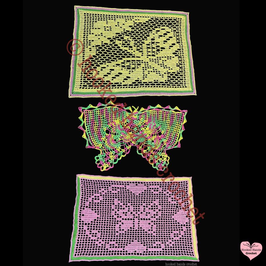 Butterflies are beautiful, so anything with them instantly becomes just a little extra pretty. I made three butterflies, which I intended to be together, but they are wonderful on their own. This one’s a classic filet piece, which means a series of open and closed spaces to create a design. This is from a vintage pattern, probably from the 1980s. Since there were hearts, I chose pink. The border was also my choice. I wanted to create an early Spring feel, maybe with a wink to St. Valentine’s Day.
